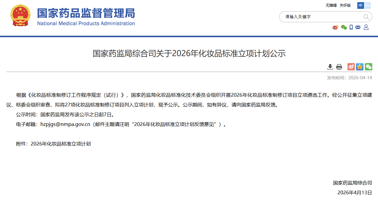 중국 국가약품감독관리국(NMPA)이 화장품 원료의 안전성 관리와 효능 평가 체계를 대폭 강화하기 위한 2026년도 표준 제·개정 로드맵을 공개했다. NMPA는 오는 20일 '화장품 표준 제·개정 작업 절차 규정(시행)'에 따라 화장품 표준화 기술위원회가 선정한 총 27개의 화장품 표준 입안 계획을 확정할 예정이다. 지난 13일부터 7일간 공개 의견 수렴 절차를 거치는 중인 이 안이 최종 확정되면 각 분과위원회를 통해 본격적인 표준안 기안과 검증이 진행된다.