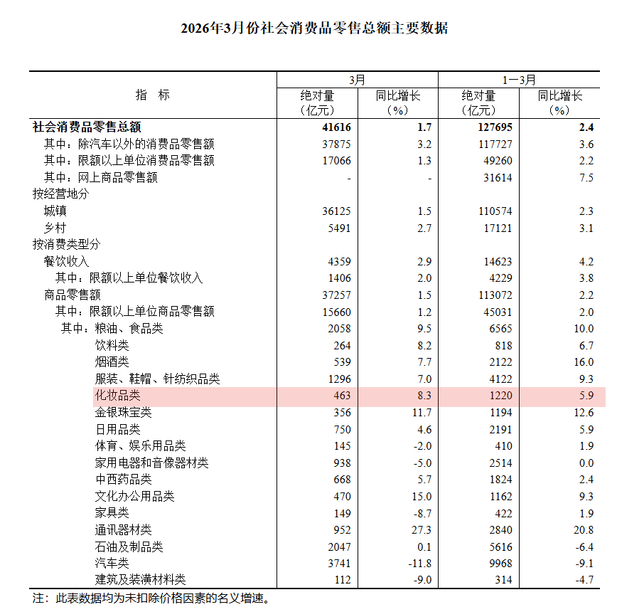 중국 화장품 소비가 올해 1분기 견조한 회복세를 나타내며 전체 소비 시장 성장을 주도하고 있다. 중국 국가통계국이 발표한 2026년 3월 사회소비품 소매총액 데이터에 따르면, 화장품류 소매액은 463억 위안으로 전년 동기 대비 8.3% 증가했다. 중국 전체 사회소비품 소매총액 증가율인 1.7%보다 6.6%P나 높은 수치다. 올해 1~3월 누적 화장품 소매액은 1220억 위안을 기록하며 전년 대비 5.9% 성장했다. 3월 한 달간의 성장률이 1분기 누적치보다 높아, 분기 후반으로 갈수록 화장품 소비 심리가 탄력을 받은 것으로 나타났다.