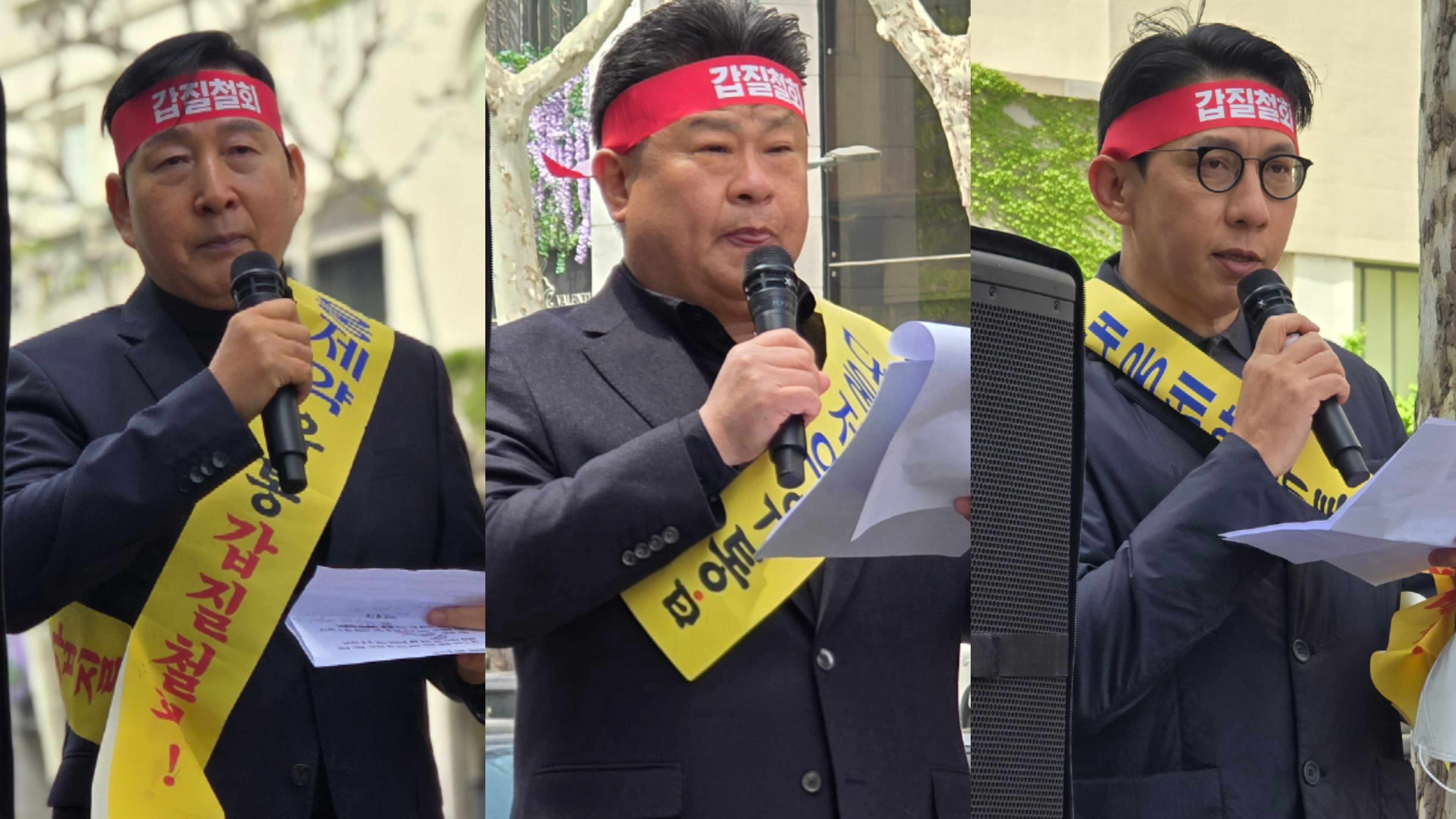 (왼쪽부터) 박호영 한국의약품유통협회장, 정성천 서울시의약품유통협회장, 현준재 한국의약품유통협회 부회장이 대웅제약 거점도매 정책을 비판하며 발언하고 있다. ©약업신문=전하연 기자