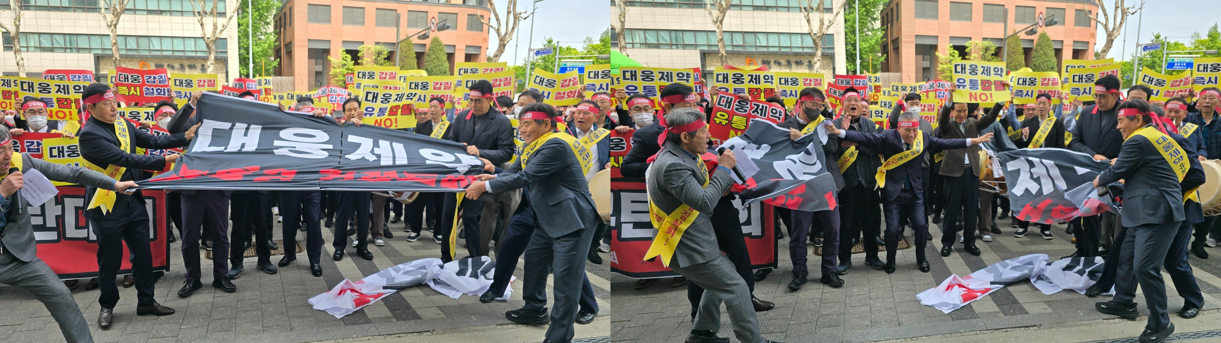 현장에서는 ‘대웅제약 유통갑질 철회’ 문구가 적힌 대형 현수막을 찢는 퍼포먼스가 펼쳐지며 긴장감이 최고조에 달했다. 참가자들은 현수막을 양쪽에서 잡아당겨 찢어내며 유통 생태계를 위협하는 정책을 좌시하지 않겠다는 의지를 상징적으로 드러냈다.