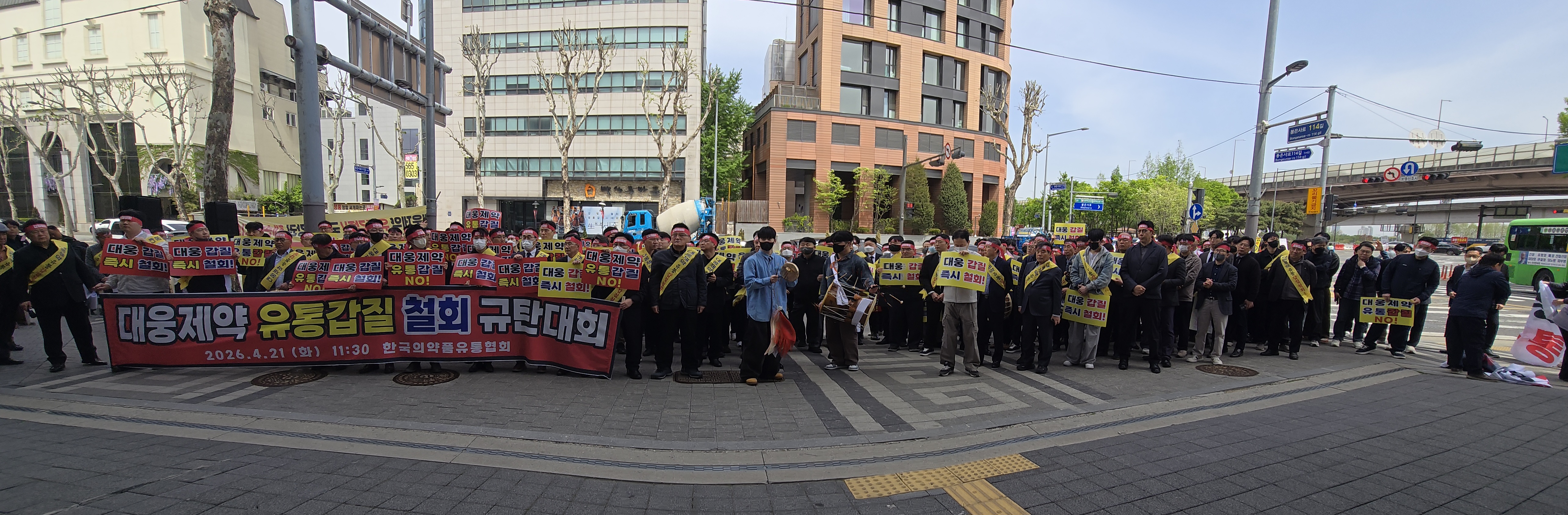 21일 오전 11시30분 서울 강남구 대웅제약 본사 앞에는 전국 각지에서 모인 의약품 유통업체 대표와 종사자 약 300여 명이 집결하며, 당초 예상 규모를 크게 웃도는 인파로 현장 열기가 고조됐다. 이날 집회는 북소리와 구호가 이어지는 가운데 ‘유통 갑질 중단’과 ‘거점도매 철회’를 촉구하는 외침으로 일대를 가득 채웠다.