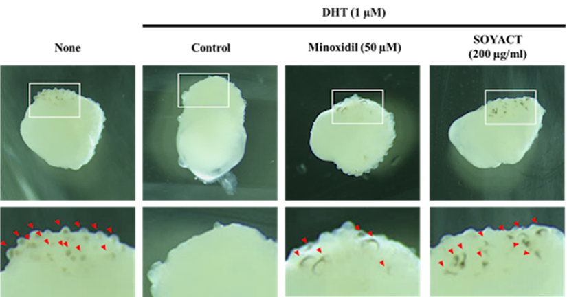 연구팀은 남성형 탈모의 주요 인자인 디하이드로테스토스테론(DHT)을 처리해 탈모 환경을 유도했다. 그 결과 모낭 수 감소, 모발 성장 저하, 피부·모발 관련 바이오마커 감소 등 탈모 환자에서 관찰되는 특징이 동일하게 재현됐다.