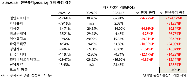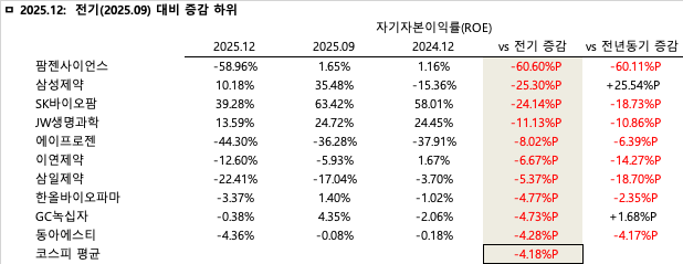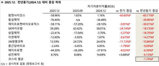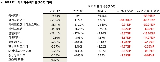 전년 동기 대비 ROE가 가장 크게 감소한 코스피 기업 역시 팜젠사이언스로, -60.11%p 수직 하락하며 연간 수익성 지표의 약화를 보인 것으로 분석된다. 아울러 동성제약, 에이프로젠바이오로직스, SK바이오팜 등 투자 지출 누적 및 이익률 방어에 난항을 겪은 기업들이 하위권에 포진하며 체질 개선의 과제가 제기됐다.