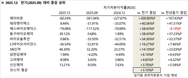코스닥 제약·바이오 60개사의 경우 2025년 12월 평균 ROE가 -2.57%를 기록해 코스피 시장보다 수익성 악화 폭이 컸다. 다만 코스닥은 전기 대비 3.10%p, 전년 동기 대비 1.40%p 각각 반등하며 점진적인 수익성 회복 기조를 보였다.