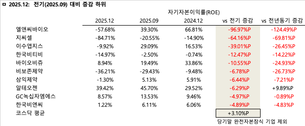 전기 대비 ROE가 가장 크게 감소한 코스피 기업은 팜젠사이언스로, -60.60%p 하락하며 단기 수익성 악화를 나타낸 것으로 분석된다. 아울러 삼성제약, SK바이오팜, JW생명과학 등 기저효과 소멸 및 일회성 비용이 반영된 기업들이 하위권에 포진하며 시장 전반의 수익성 하방 압력이 작용하고 있음을 보여주었다.