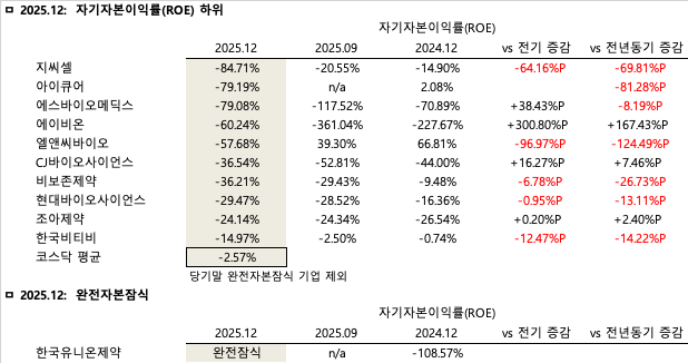 코스닥 상장사 중 당기 말 ROE가 가장 낮은 하위 10개 기업은 지씨셀(-84.71%), 아이큐어(-79.19%), 에스바이오메딕스(-79.08%), 에이비온(-60.24%), 엘앤씨바이오(-57.68%), CJ바이오사이언스(-36.54%), 비보존제약(-36.21%), 현대바이오사이언스(-29.47%), 조아제약(-24.14%), 한국비티비(-14.97%) 순으로 확인됐다.