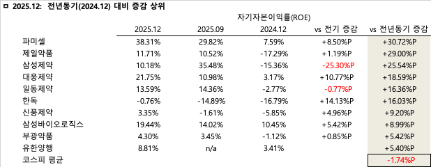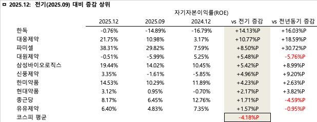 2025년 12월 기준 상장 제약·바이오 기업들의 수익성 지표가 전반적으로 다소 부진한 가운데, 일부 우량 기업들을 중심으로 견조한 자본 효율성을 입증한 것으로 나타났다.