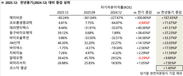 전기 대비 ROE 증감률은 에이비온이 300.80%p 수직 상승하며 단기적인 수익성 개선을 강하게 이끈 것으로 분석된다. 아울러 테라젠이텍스, 에스바이오메딕스, 동구바이오제약 등 실적 기저효과 및 사업 다각화에 나선 기업들이 상위권에 대거 포진하며 단기 반등 기조가 꾸준히 이어지고 있는 것으로 나타났다.
