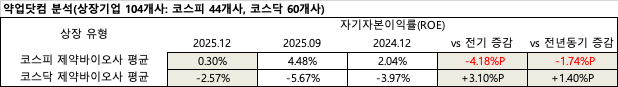 약업닷컴이 상장 제약·바이오 기업 104개사(코스피 44개사, 코스닥 60개사)의 2025년 12월 기준 자기자본이익률(ROE)을 분석한 결과, 코스피 제약·바이오 44개사의 평균 ROE는 0.30%로 전년 동기 대비 1.74%p 하락했으며, 전기 대비로도 4.18%p 감소한 수치를 보였다.