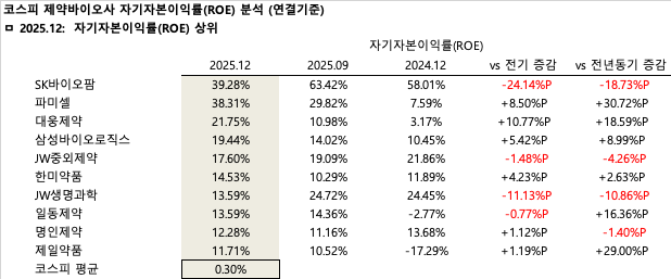 2025년 12월 기준 ROE 규모는 SK바이오팜이 39.28%를 기록하며 코스피 시장 내 자본 운용의 효율성을 가장 강하게 견인한 것으로 분석된다. 아울러 파미셀, 대웅제약, 삼성바이오로직스 등 뚜렷한 글로벌 실적 모멘텀과 고부가가치 창출력을 지닌 기업들이 상위권에 대거 포진하며 핵심 우량주로서의 위상이 꾸준히 이어지고 있음을 확인할 수 있다.