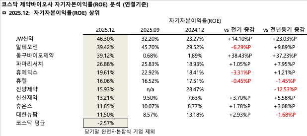 당기 말 ROE 규모는 JW신약이 46.30%를 기록하며 코스닥 시장 내 자본 수익성을 강하게 견인한 것으로 분석된다. 아울러 알테오젠, 동구바이오제약, 파마리서치 등 독점적 기술력과 확고한 시장 점유율을 지닌 리딩 기업들이 상위권에 대거 포진하며 기술집약적 기업들의 우월한 부가가치 창출력이 꾸준히 이어지고 있음을 증명했다.