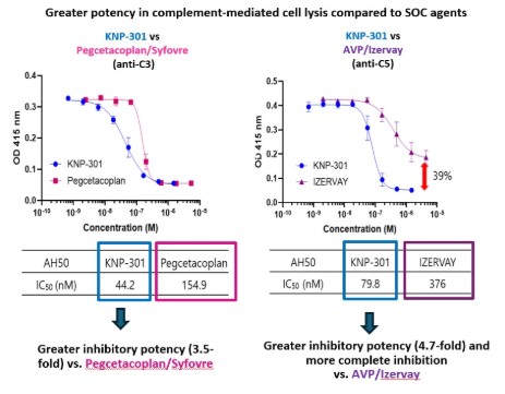 카나프테라퓨틱스는 이번 ARVO 2026에서 KNP-301과 습성 황반변성 및 지도모양위축 표준치료제(Standard of Care, SOC)와 직접 비교한 전임상 효능 평가 데이터를 공개할 예정이다. KNP-301은 습성 황반변성 표준치료제인 Eylea(aflibercept) 및 Vabysmo(faricimab)과 동등한 수준의 억제 효능을 보였으며, 보체 대체경로 용혈 분석에서는 지도모양위축 표준치료제인 Syforvere(pegcetacoplan) 및 Izervay(avacincaptad pegol) 대비 더 강한 억제 활성을 확인했다. 특히 IC50(50% 억제농도) 값은 Syforvre 대비 약 3.5배, Izervay 대비 약 4.7배 낮게 나타나, KNP-301 보체 억제 효능을 뒷받침했다.