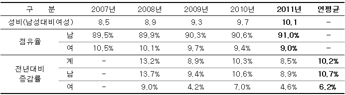 성별 비율은 2007년 8.5배에서 2011년 10.1배로 남성 진료인원이 전체 환자의 90% 이상을 차지하는 추세이며, 연평균 증가율도 남성 10.7%, 여성 6.2%로 남성이 약 4.5% 더 높은 것으로 나타났다.