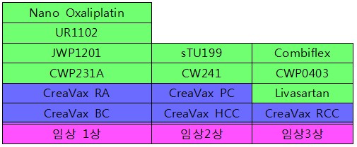2010년에는 간암 치료제인 ‘크레아박스-HCC’가 2상 임상 승인을 받고, 현재 서울대병원 등에서 임상 시험을 추진하고 있다. 이외에도 류머티스 관절염치료제 ‘크레아박스-RA’, 전립선암 치료제 ‘크레아박스-PC’, 교모세포종 환자 치료제 ‘크레아박스-BC’등을 갖추고 있다.