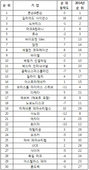 이밖에도 ‘톱 10’에 포함된 곳들 가운데 바이오젠 Idec社, 암젠社 및 세엘진 코퍼레이션社 등이 순위가 크게 뛰어올라 눈길을 끌었다.