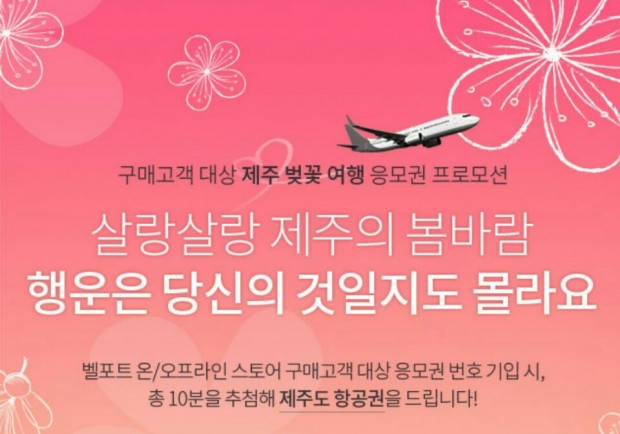 뷰티 멀티스토어 벨포트(www.belport.co.kr)가 벚꽃 시즌을 맞아 제주도 왕복 항공권을 사은품으로 증정하는 프로모션을 진행한다.