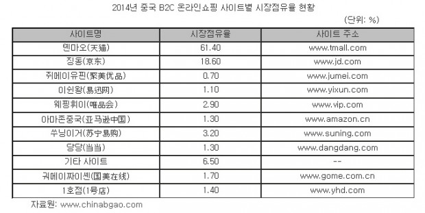 중국 국가통계국에 따르면 올해 7월까지의 중국 전체 전자상거래 시장 규모는 1조9,000억 위안으로 전년 동기 대비 37.7%가 증가했다. 2014년 전자상거래 시장 규모는 2조8,000억 위안이었는데, 특히 B2C 거래 규모(1조2,900억 위안)가 전체 모바일·온라인 쇼핑 거래액의 45%를 차지했다. 중국 유통업계는 전자상거래 시장이 향후 27%의 성장률을 유지하며 꾸준히 확대될 것으로 내다보고 있다.