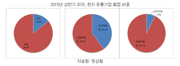 유통산업 리서치 플랫폼인 롄상왕이 발표한 ‘2015년 상반기 주요 소매기업 폐점 통계’에 따르면 올해 6월까지 백화점과 대형마트 121개 매장이 폐점했다. 이 중 백화점이 25개로 지난해의 23개를 초과했고 대형마트는 총 96개였다. 올 상반기 매장을 닫은 유통업체 가운데 현지 비중이 86%로 해외 업체에 비해 훨씬 높은 것으로 나타났는데, 해외 유통기업의 경우 2014년에 이미 141개 매장을 폐점하며 지난해 전체 폐점수의 70%를 차지했기 때문이다.