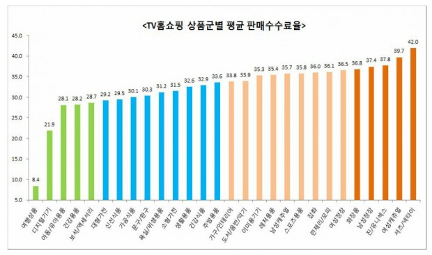 TV홈쇼핑의 상품군별 평균 판매 수수료율은 의류와 화장품이 높고 여행상품, 디지털기기, 아동/유아용품 등이 낮게 나타났다. 상위 판매 수수료율 상품군은 셔츠·넥타이(42.0%), 여성캐주얼(39.7%), 진/유니섹스(37.8%), 남성정장(37.4%), 화장품(36.8%) 등이었으며, 하위 판매 수수료율 상품군은 여행상품(8.4%), 디지털기기(21.9%), 아동/유아용품(28.1%), 건강용품(28.2%) 등이었다.