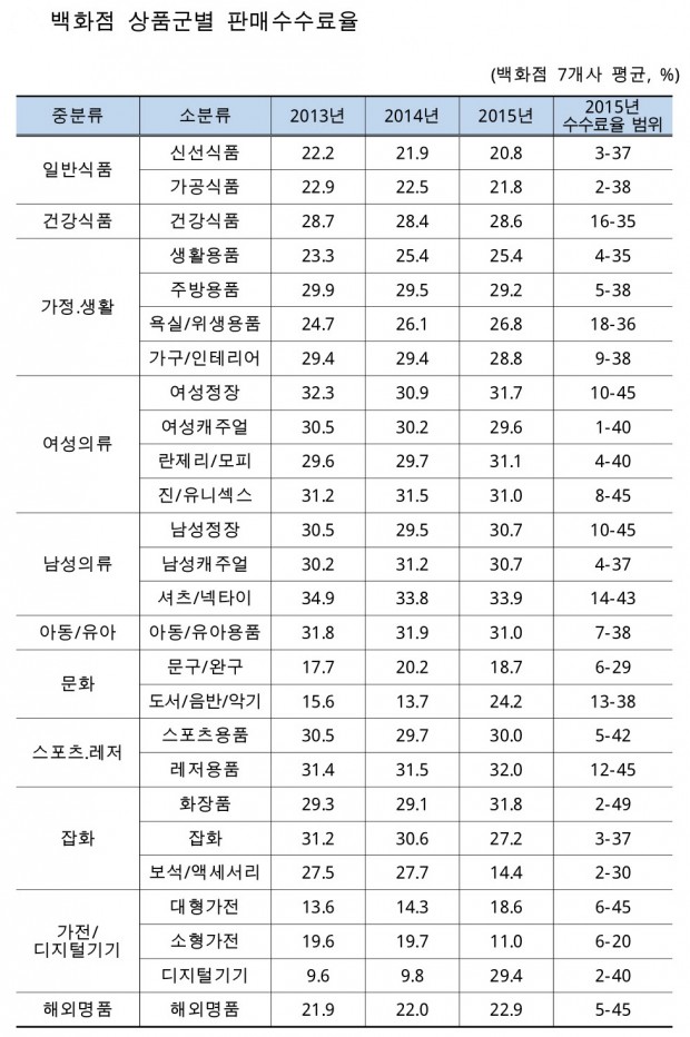 백화점의 상품군별 평균 판매 수수료율은 의류가 높고 가전, 문구, 신선제품 등은 낮은 것으로 조사됐다. 상위 판매 수수료율 상품군은 셔츠·넥타이(33.9%), 레저용품(32.0%), 잡화(화장품, 보석/액세서리 포함. 31.8%) 등이었으며, 하위 판매 수수료율 상품군은 디지털기기(11.0%), 대형가전(14.4%), 소형가전(18.6%) 등이었다.