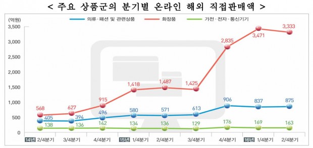 통계청이 발표한 ‘2016년 2/4분기 온라인 해외 직접판매 및 구매 동향’ 자료에 따르면, 화장품은 지난해부터 두드러진 면모를 보이고 있다. 올해 2분기 화장품의 해외 직접판매액은 3,333억원으로 이전 분기에 비해 138억원이 감소했으나 여전히 2~3위 품목(의류·패션 및 관련 상품, 가전·전자·통신기기)과 큰 격차를 나타냈다. 2분기 의류·패션 및 관련 상품 판매액은 875억원, 가전·전자·통신기기 판매액은 163억원이었다.