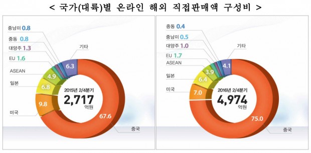 국가(대륙)별 온라인 해외 직접판매액은 중국 3,732억원, 미국 350억원, 일본 317억원, 아세안 192억원으로 중국이 전체의 75.0%를 차지했다. 전년 동분기 대비 중동(-7.4%)은 감소했으나 중국(103.1%), 일본(72.1%), 미국(31.5%), 아세안(43.3%), EU(95.7%) 등은 큰 폭으로 증가했다. 통계청은 국가별 구매 상품 목록을 공개하지는 않았지만 이런 결과는 중국 하이타오족의 한국 화장품 선호가 갈수록 늘고 있기 때문인 것으로 분석된다.