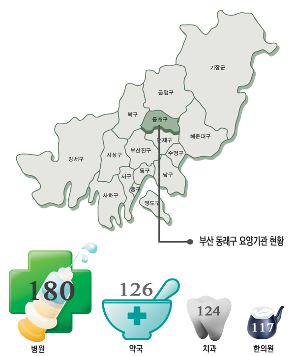 건강보험심사평가원의 청구자료를 바탕으로 부산광역시 동래구의 의료기관 현황(2016년 1월기준)을 살펴보면, 의원이 165곳, 병원 15곳, 약국 126곳, 치과병의원 124곳, 한의원이 117곳으로 나타났다.