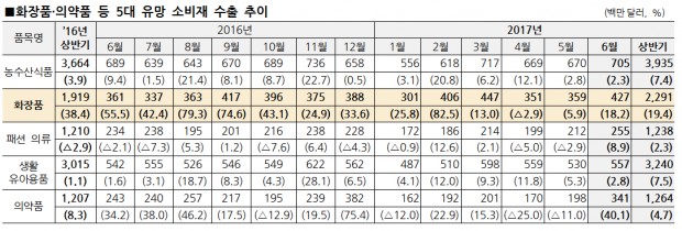 산자부는 올 1월부터 MTI 기준에 화장품(MTI2273), 생활용품(MTI51), 패션의류(MTI441+5212+991) 등을 포함시켜 집계하고 있다. 연간 통계확정시(2018년 2월)까지 일부 수치는 정정 가능하다.