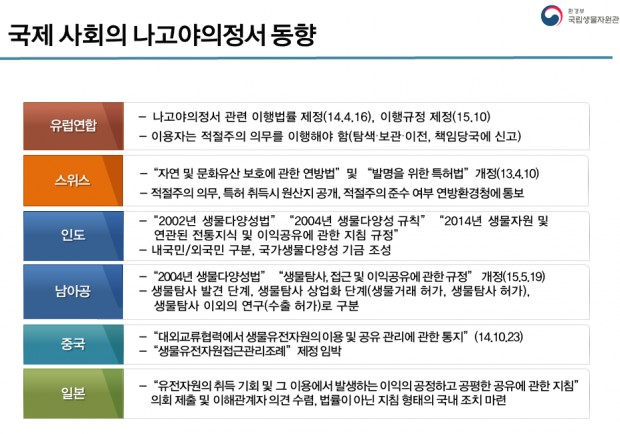 식품의약품안전처 이동희 바이오생약국장은 "1995년쯤 부터 나고야의정서가 논의되었지만 20여년동안 준비가 소홀했다. 우선 원료 시장에 대한 조사가 필요하다”고 말했다.