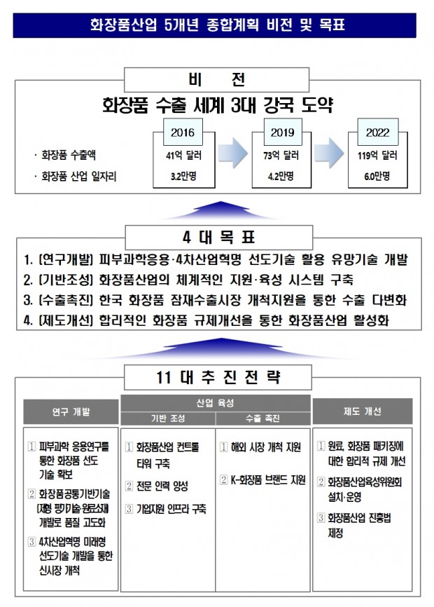 정부가 오는 2022년까지 '화장품 수출 세계 3대 강국 도약'을 비전으로 내세운 화장품산업 종합 육성 계획을 내놓았다. UN Data에 따르면, 2016년 기준 대한민국은 프랑스, 미국, 독일, 이탈리아에 이어 화장품 수출국 5위다.