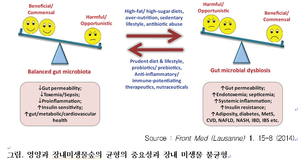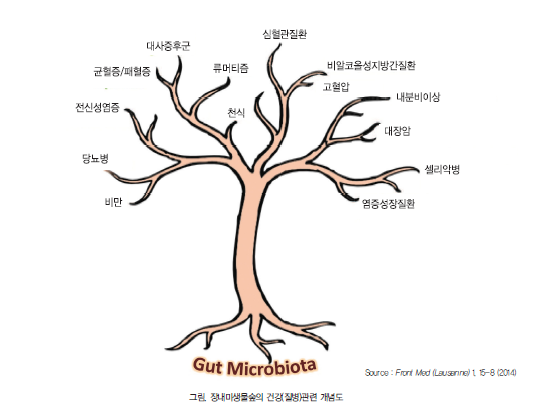 옛날에는 ‘개똥이, 쇠똥이’처럼 아명(兒名)을 불렀다. 저승사자를 피할 수 있다는 미신에서 생겨난 호칭이다. 태어난 아이들 중 많은 수가 첫돌 전에 목숨을 잃었기 때문이다. 콜레라, 천연두, 결핵 등 치명적인 전염병도 한몫을 했다. 물을 정화하여 식수로 사용할 뿐만 아니라 여러 분야에서 위생상태가 좋아지고, 예방접종이 보급되면서 영유아기 생존율은 높아졌다. 특히 의학기술 발달과 함께 항생제 사용이 큰 역할을 하여 수명까지 획기적으로 연장시켰다. 21세기에 들어서면서 미생물 감염병은 감소하고 있으나, 기름지고 설탕이 풍부한 음식으로 인하여 대사성 질환, 소화기염증성 질환 등 현대 질병이 증가하고 있다. 이러한 질병은 우리 몸 안팎에 공생하며 상호작용을 하고 있는 미생물의 작용으로 밝혀지고 있다. 현대 생활 병을 예방하거나 증세를 경감시키려면, 미생물숲(microbiota)이란 생태계의 다양성 유지가 중요해 지고 있다. 따라서 장내미생물숲을 건강하게 육성하고 보호하기 위해서는 장내를 유익균이 우점(優占)할 수 있는 생태환경을 조성해야 한다.