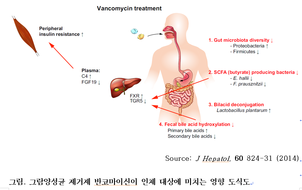 더군다나, 장내미생물숲이 잘 정착되지 않은 어린 시기에는 항생제에 의한 작은 교란도 성장한 후에 큰 차이가 발생한다. 변형된 장내미생물숲을 가지고 성장하면 정신질환 등의 발생이 증가한다(Martin J B, et al. Nature 488 621-6, 2012). 항생제 오남용은 장내 유익균을 사라지게 하여 뇌의 해마 신경세포 발생·성장을 저해하여 기억력 감퇴나 치매 등의 뇌기능 장애를 초래할 수 있다(Moechle L, et al.: Cell Reports 15 1945-56, 2016). 클린다마이신은 상당수의 장내 미생물을 사멸시켜서 탄수화물과 담즙산 대사 능력을 떨어뜨리고 장내 흡수를 저하시켜서 삼투성 설사를 일으킨다. 더욱이 기존 미생물군집에 억제되었던 병원성 균(Clostridium difficile, Salmonella kedougou 등)을 왕성하게 성장시켜 위막성 대장염이나 심각한 출혈성 대장염을 일으킬 수 있다(Schroeder O. et al.: Z Gastroenterol 44(2) 193-204, 2006). 당펩티드(glyco-peptide)계 항생물질 반코마이신(vancomycin)을 비만 남성에게 투여하면 장내미생물의 다양성이 저하되고, 낙산(酪酸, 브티르산)을 생성하는 미생물 비율도 낮아지고, 비만인에게서는 말초 인슐린 감수성을 낮추어 심장병과 당뇨병까지 초래할 수 있다(Vrieze A, et al.: J Hepatol. 60 824-31, 2014).