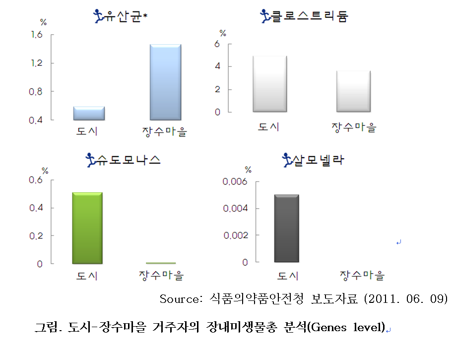식품의약품안전처의 2011년도 연구결과에 따르면, 농촌의 장수마을 거주자의 장내미생물 분포가 도시거주자에 비해 유익균이 3~5배 높다고 한다. 건강한 삶을 위해서 채식과 유산균이 다랑 함유된 김치, 된장 등 발효식품을 많이 섭취하는 것을 권장하기도 하였다(식약처 보도자료). 통계청 자료에 의하면, 농가 인구가2015년 12월 1일 기준 256만여 명이라고 한다. 인구의 95%가 도시화된 생활을 하는 현대인으로서는 농업사회에서 즐겨먹던 유익균이 좋아하는 식품을 활용할 수 있어야 장 건강을 지킬 수 있을 것으로 보인다. 항생제 사용을 최소화 하고, 설탕(과당)은 줄이고 올리고당은 올리고, 가공 식품을 멀리하고 통곡 식품은 가까이 하여 스스로 장내미생물숲을 잘 지키고 현대 질병에서 자유로운 튼튼한 100세 시대를 맞이해야 하겠다.