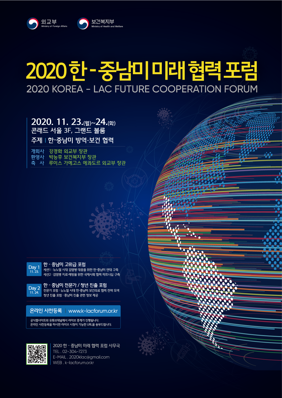 포럼 1일차 '한-중남미 고위급포럼'(23일)에서는 강경화 외교부 장관의 개회사, 박능후 복지부 장관의 환영사, 루이스 가예고스(Luis Gallegos) 에콰도르 외교부 장관의 축사에 이어, 제1세션은 '뉴노멀 시대 감염병 대응을 위한 한-중남미 연대 구축'을 주제로, 제2세션은 '감염병 치료·예방을 위한 국제사회 협력 파트너십 구축'을 주제로 발표와 토론이 진행된다.