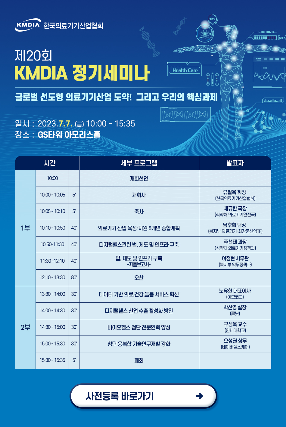 이번 ‘제20회 KMDIA 정기세미나’는 ‘글로벌 선도형 의료기기산업 도약! 그리고 우리의 핵심과제’를 슬로건으로 ‘디지털 신시장 창출’ ‘바이오헬스 수출 활성화’라는 목표를 달성하기 위한 정부의 정책 및 지원종합계획 등을 파악하고 앞으로 의료기기산업 혁신의 방안을 모색하기 위한 소통의 장으로 마련됐다.