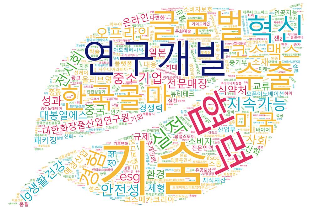 약업신문 자매지 화장품신문이 2024년 11월 뉴스 데이터를 분석한 결과 화장품 업계의 핫이슈 키워드는 '연구개발' '기술' '협력'으로 나타났다. 이어 '글로벌' '혁신' '수출' 등의 키워드도 높은 노출 빈도를 보였다.