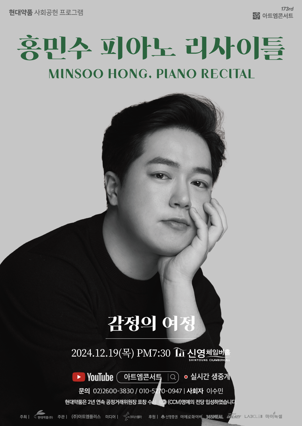 현대약품은 오는 19일 오후 7시30분, 제173회 아트엠콘서트로 피아니스트 홍민수의 독주회를 서울 영등포구 신영체임버홀에서 개최한다고 16일 밝혔다.