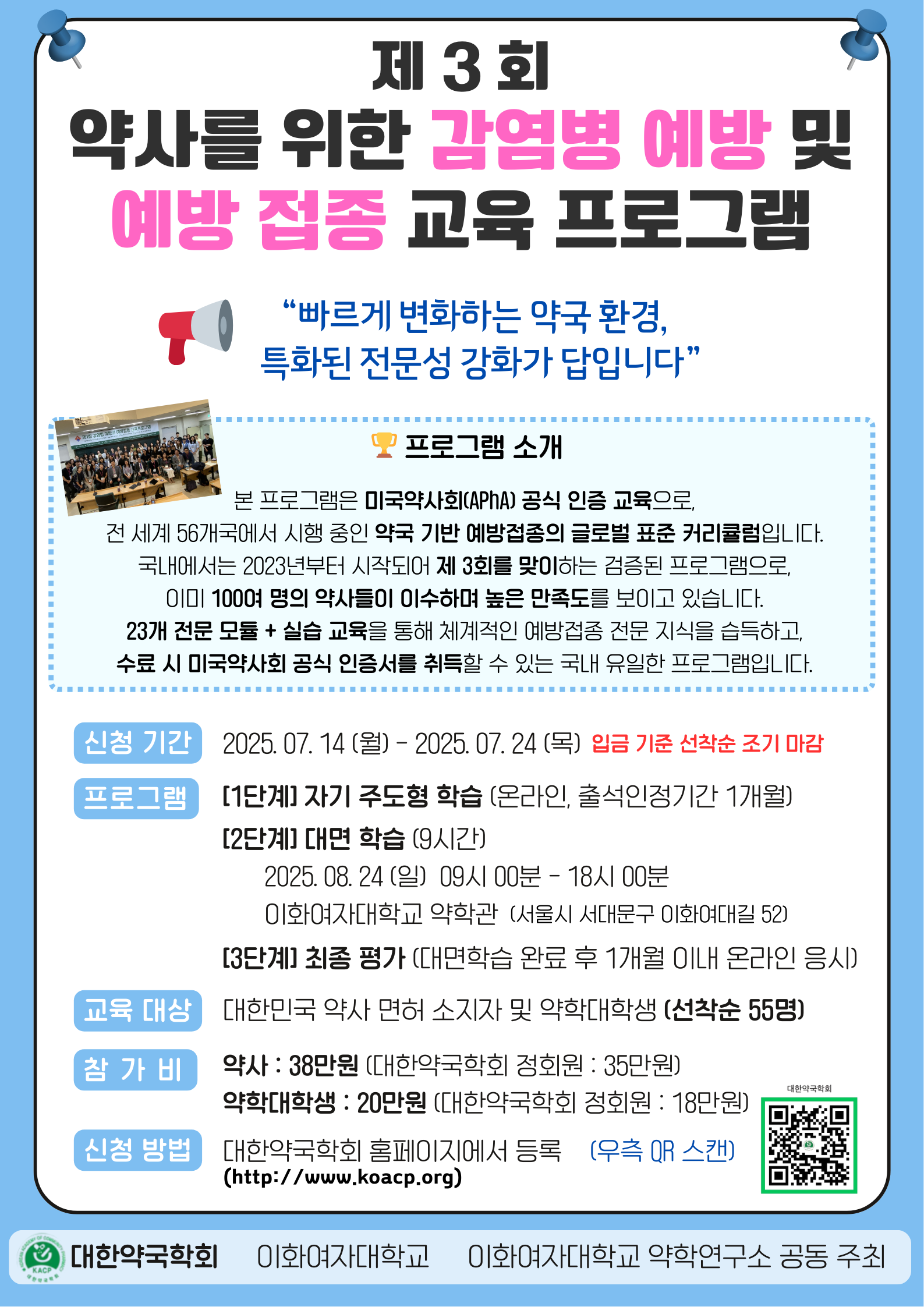 이 교육은 이화여자대학교, 대한약국학회, 이화여자대학교 약학연구소가 공동 주관하며, 국내에서 유일하게 미국약사회 인증서를 취득할 수 있는 기회다. 전 세계 56개국에서 시행 중인 약국 기반 예방접종 교육의 글로벌 표준으로, 코로나 팬데믹 이후 더욱 강조되는 감염병 대응 및 예방접종의 중요성을 반영해 기획됐다. 국내에서는 2023년 처음 도입돼 올해로 3회를 맞았으며, 기존 100여 명의 약사 및 약학대학생이 수료 후 높은 만족도를 보였다.