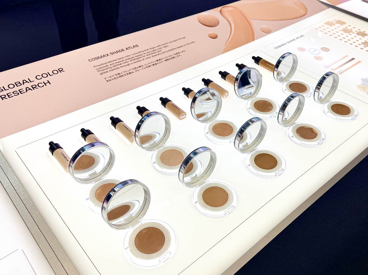 셰이드 아틀라스는 코스맥스의 글로벌 네트워크를 기반으로 국가별 베이스 메이크업 제품을 분석해 축적한 데이터로 맞춤형 색상 컨설팅을 제공하는 서비스다. 진출 국가, 타깃 소비자층 등 고객사의 요청사항과 코스맥스가 사회 트렌드 및 라이프 스타일을 고려해 연 2회 도출하는 트렌드 컬러를 조합해 선보이는 맞춤형 솔루션이 방문객의 높은 호응을 얻었다.