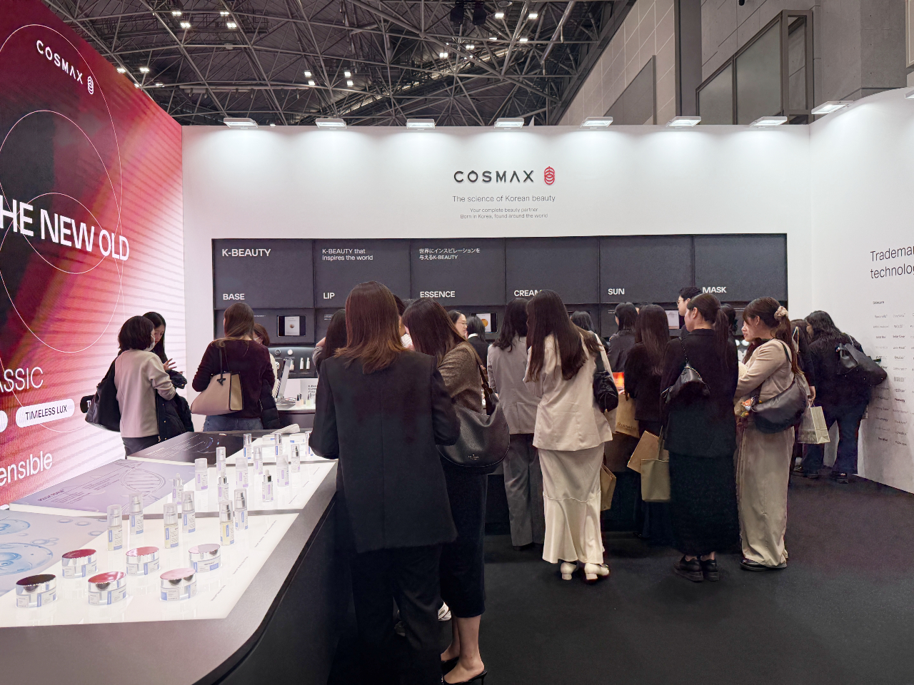 K-뷰티 존에는 선케어, 에센스, 립, 마스크 팩을 비롯해 최근 일본 시장에서 높은 인기를 구가하는 베이스 메이크업 제품을 전면에 내세워 현지화한 제형을 대거 선보였다. 특히, 기존 스펀지 형태 쿠션 파운데이션에서 메시 쿠션 파운데이션으로 소비자 선호도가 변화하는 흐름에 맞춰 3개 존에 모두 메시 쿠션을 전면 배치해 코스맥스의 제형 경쟁력을 강조했다.