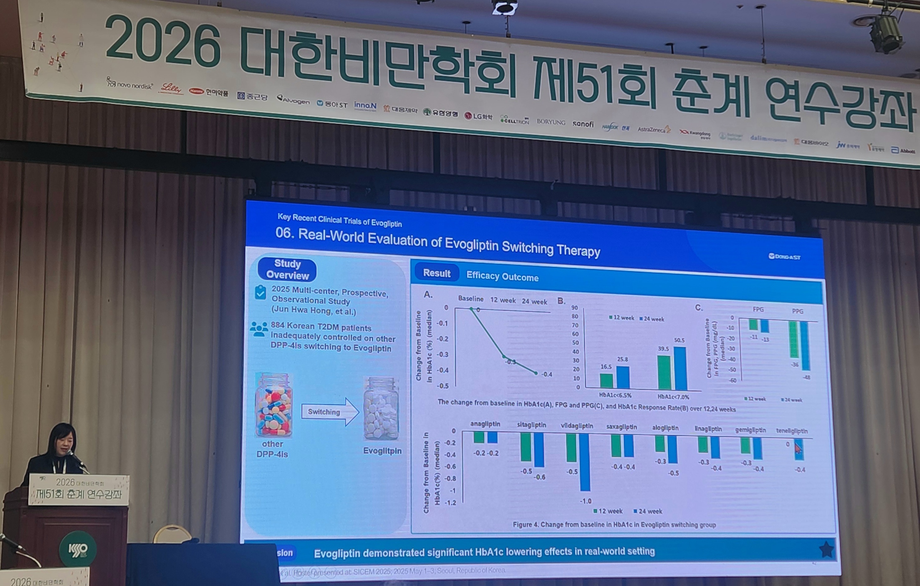 강연에서는 Evogliptin(슈가논)을 중심으로 한 DPP-4 억제제의 근거: 한국인 환자에서 evogliptin을 고려해야 하는 이유 등을 다뤘다. 주요 내용으로는 ▲65세 이상 고령 당뇨병에서 evogliptin을 24주 이상 장기 투여 시 유의미한 당화혈색소 감소 효과 안전성 입증 ▲다른 DPP-4 억제제로 혈당 조절이 불충분 환자에서 evogliptin으로 전환시 당화혈색소 추가 감소, 공복혈당 및 식후혈당 개선 결과 ▲ SGLT2 억제제인 dapagliflozin과 evogliptin의 병용요법의 당화혈색소 감소 및 안전성 내용 등을 다뤘다.