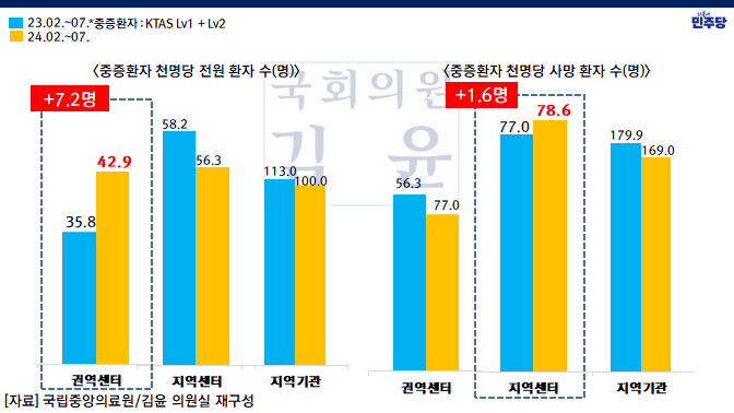 국회 보건복지위원회 소속 더불어민주당 김윤 의원(비례대표)은 국립중앙의료원으로부터 의료공백 기간인 지난 2월부터 7월까지의 응급실(권역응급의료센터, 지역응급의료센터, 지역응급의료기관) 환자 내원 현황 자료를 제출받아 전년 동기와 비교한 결과, 권역응급의료센터의 중증 응급환자 전원이 늘어나며, 지역응급의료센터 내의 중증 응급환자 사망이 늘어나는 추세인 것을 확인했다고 10일 밝혔다.