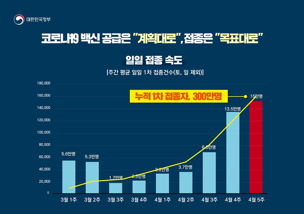 홍 총리 대행은 “오는 6월 말까지 도입이 확정된 화이자 및 아스트라제네카 백신 1,809만회분 중 지금까지 387만회분이 계획대로 차질없이 공급됐고, 화이자의 경우 지난달 24일 이후 매주 정기적으로 공급 중”이라며 “이달 말까지 300만명을 접종할 계획이며, 제약사와 계약한 백신 도입 예정물량은 지연된 사례가 단 한 건도 없다”고 강조했다.