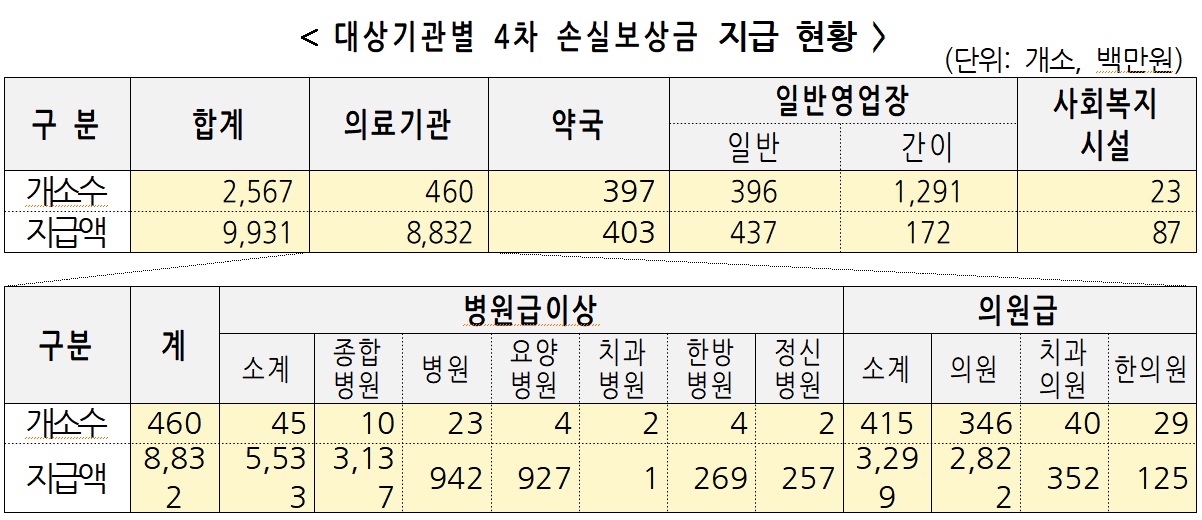 폐쇄·업무정지·소독 명령 이행과 관련한 올해 4차 손실보상금은 의료기관 460개소, 약국 397개소, 일반영업장 1,687개소, 사회복지시설 23개소 등 2,567개 기관에 총 99억원이 지급된다.
