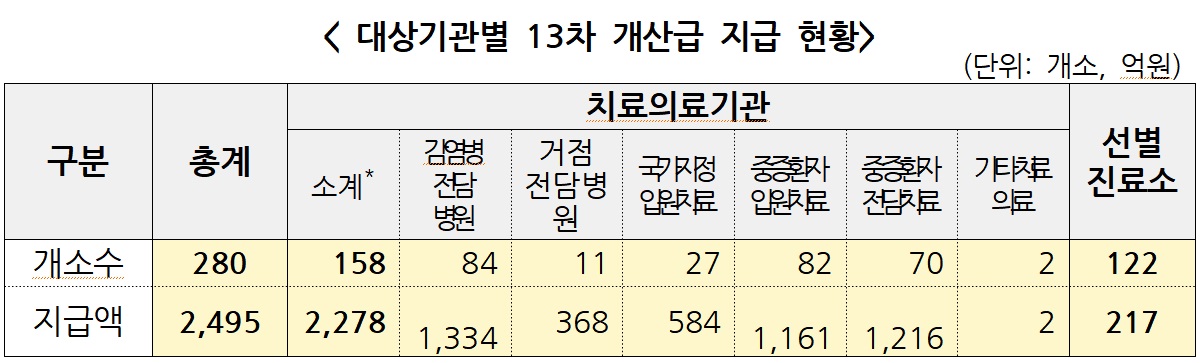 이번 13차 개산급은 280개 의료기관에 총 2,495억원을 지급하며, 이 중 2,278억원은 감염병전담병원 등 치료의료기관 158개소에, 217억원은 선별진료소 운영병원 122개소에 각각 지급한다.