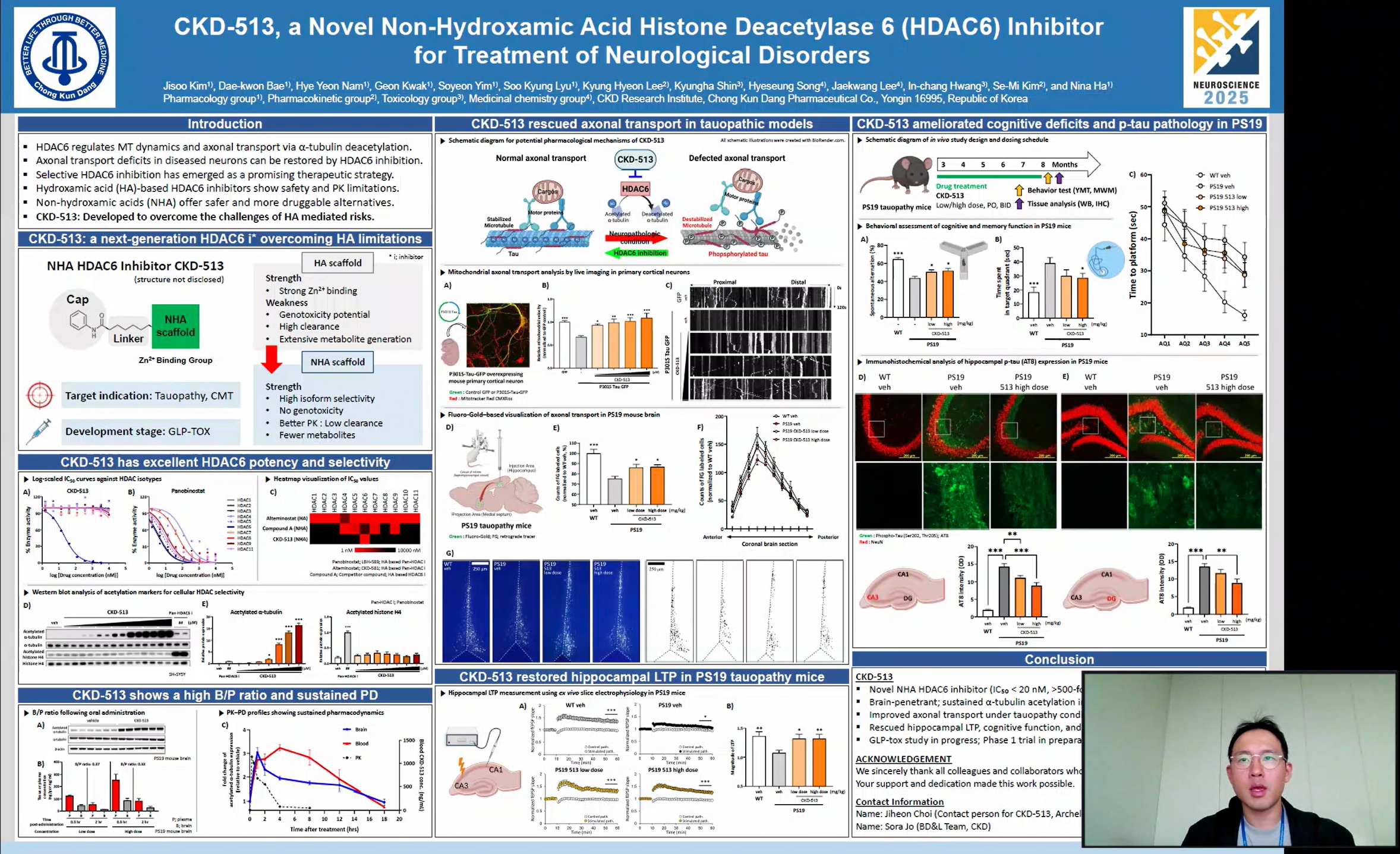 비임상 연구 결과 CKD-513은 HDAC6에 대한 높은 선택성과 우수한 뇌 투과성을 확보했으며, 타우 단백질 과발현 세포 및 질환 동물모델에서 손상된 축삭 수송을 정상 수준으로 복원시키는 것으로 확인됐다. 해당 질환 동물모델에서 인지 기능 및 기억력 회복 효과를 확인했으며, 장기기억 강화(LTP) 평가 결과 신경세포 기능 개선도 입증했다.
