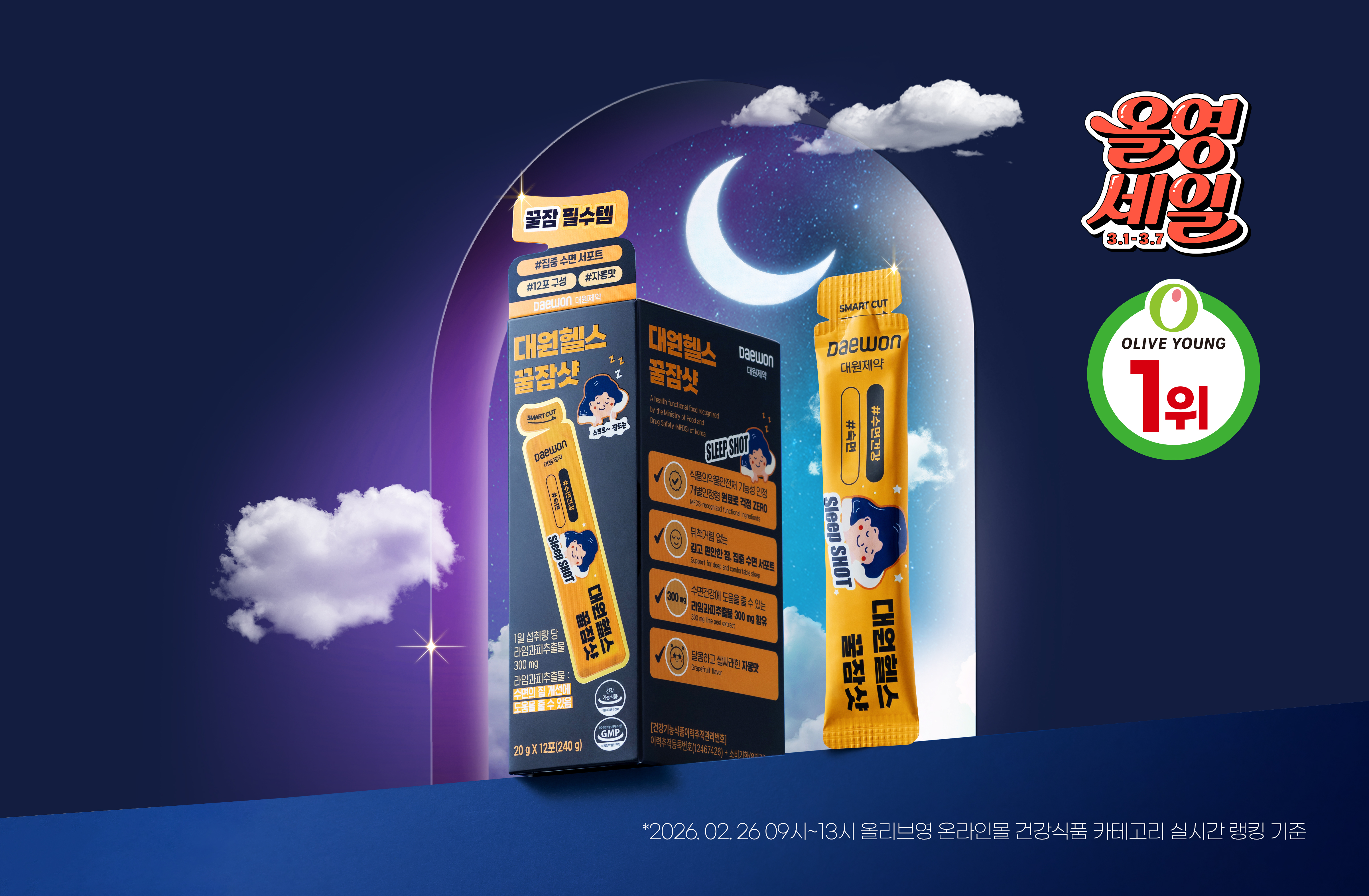 대원제약(대표이사 백승열)의 건강기능식품 브랜드 대원헬스의 신제품 ‘꿀잠샷’이 올리브영 입점과 동시에 3월 ‘올영세일’ 및 ‘슬립웰(Sleep Well) 기획전’의 주요 품목으로 선정됐다.