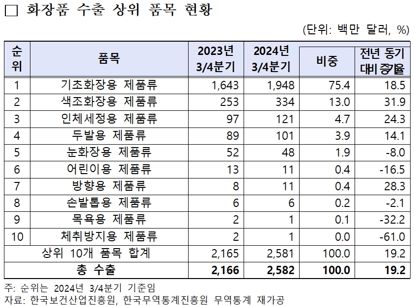 품목별로는 여전히 기초화장품이 압도적이다. 3분기 기초화장용 제품류의 수출액은 19억4800만 달러로, 전년비 18.5% 증가했다. 비중은 75.4%다. 상반기 74.7%보다 0.7%p 올랐다. 이는 역대 분기 최대 실적이다. 국가별론 미국(4억3000만 달러, +75.4%), 일본(1억6000만 달러, +25.6%), 아랍에미리트(4000만 달러, 95.8%)에서 많이 증가했다.