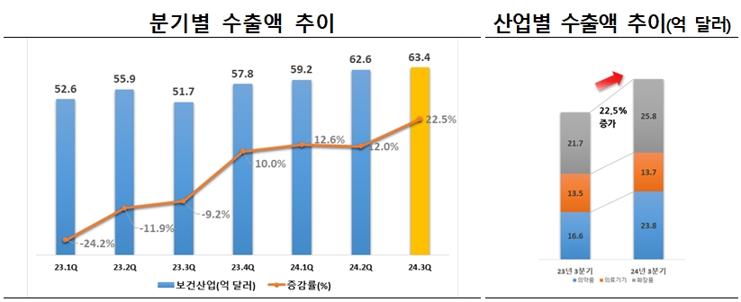 한편 보건산업 중 화장품 외엔 의약품의 수출 증가가 돋보였다. 특히 전체 의약품 수출의 약 61.3%를 차지하는 바이오의약품 수출이 전년동기 대비 74.7% 증가한 14억6000만 달러로 역대 분기 최대 실적을 기록했다. 헝가리(5억 달러, +1448.5%), 독일(1억8000만 달러, 160.3%), 벨기에(1억2000만 달러, +216.9%)에서 큰 폭으로 수출이 늘어났다.