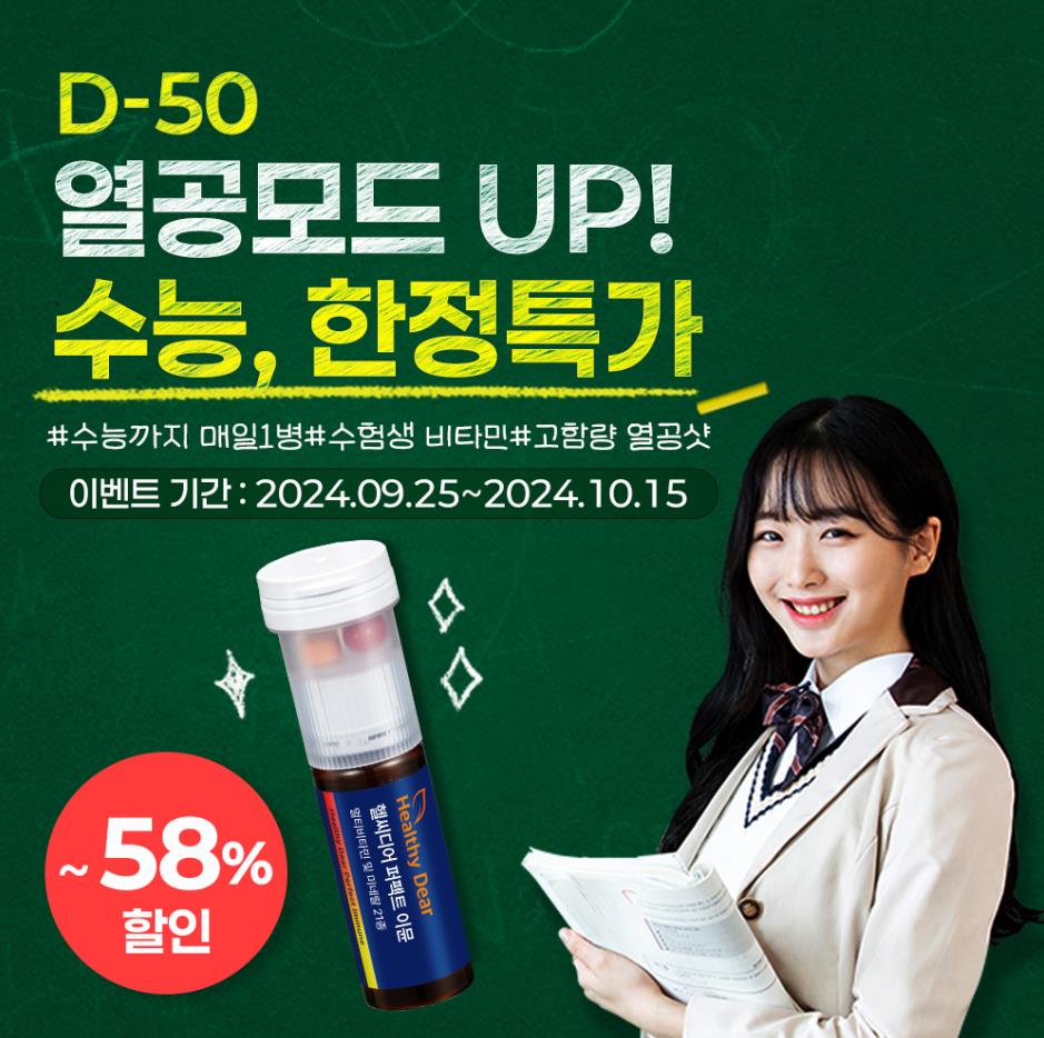 프리미엄 건강기능식품 브랜드 ‘헬씨디어’가 올해 수능을 앞두고 전국 모든 수험생 합격을 응원하는 마음을 담아 최대 58% 할인 이벤트를 진행 중이다.